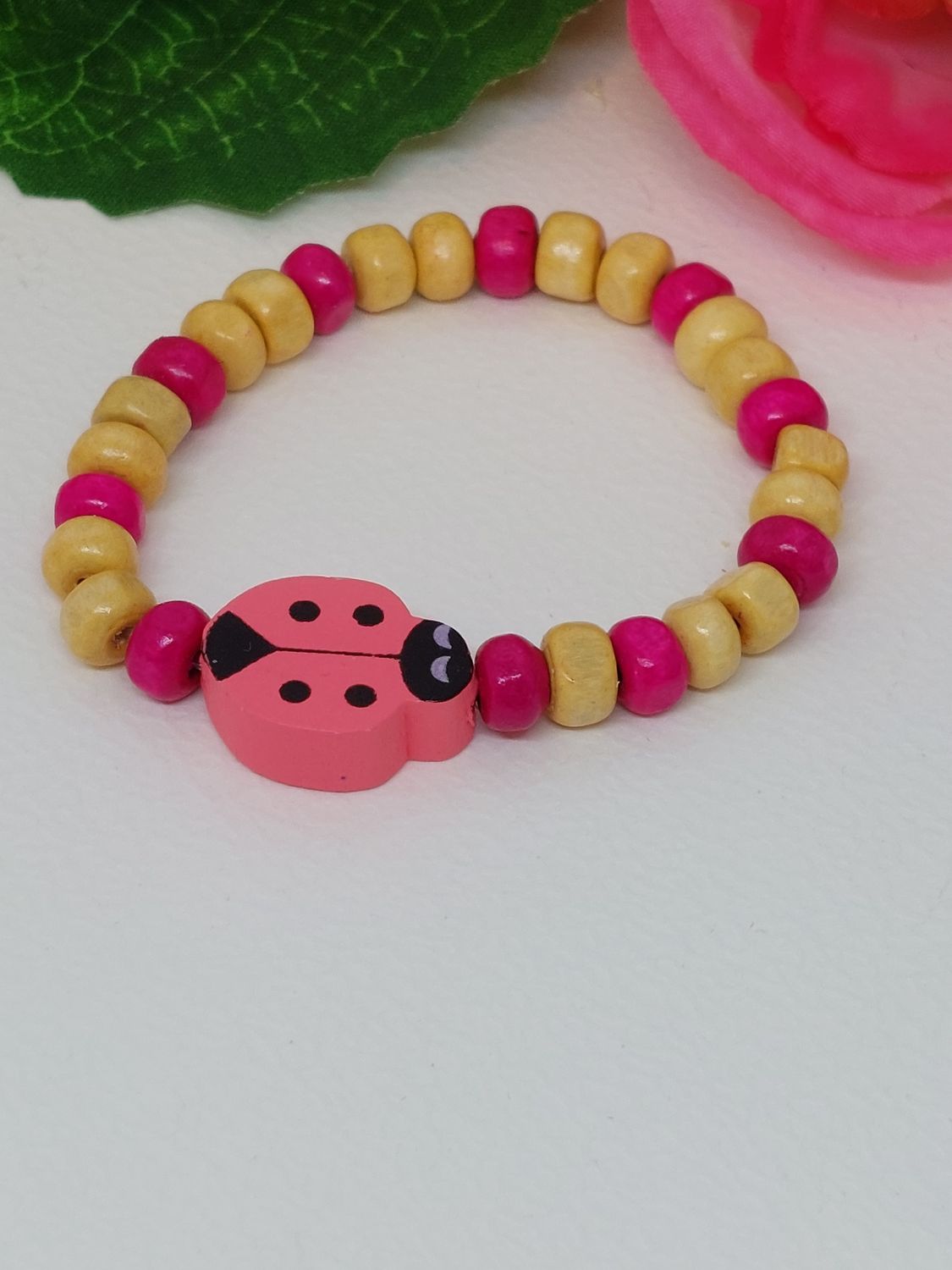 Dit armbandje is geregen op elastiek. Gemaakt van houten kraaltjes met een lieveheersbeestje. De maat is 13cm.